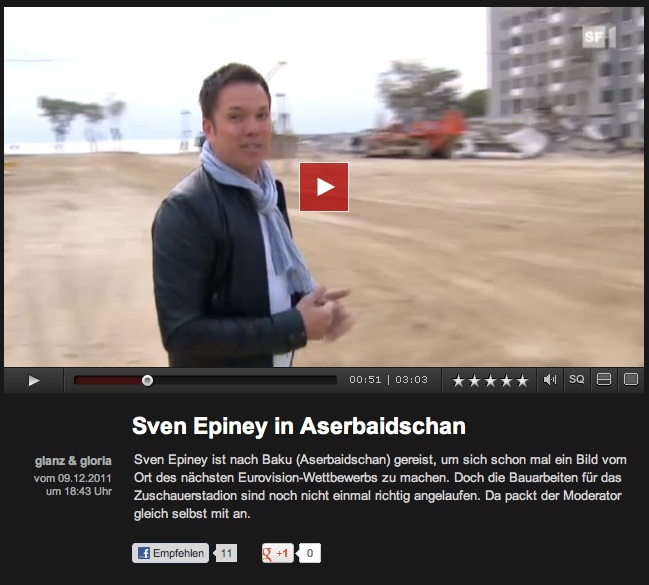 Haben also die Schweizer Medien einfach eine pikante Geschichte der FAZ verpasst? Leider nein. Es kommt noch dicker. Zwei Monate zuvor, am Schweizer Eurovision-Finale in Kreuzlingen am 10. Dezember 2011, wurde ein Video mit Sven Epiney auf SF gezeigt. Der bekannte Moderator war nach Baku gereist, um sich schon mal ein Bild vor Ort zu machen. Epiney besuchte auch die Nüssli-Baustelle für den Glaspalast und packt gleich selbst mit an.