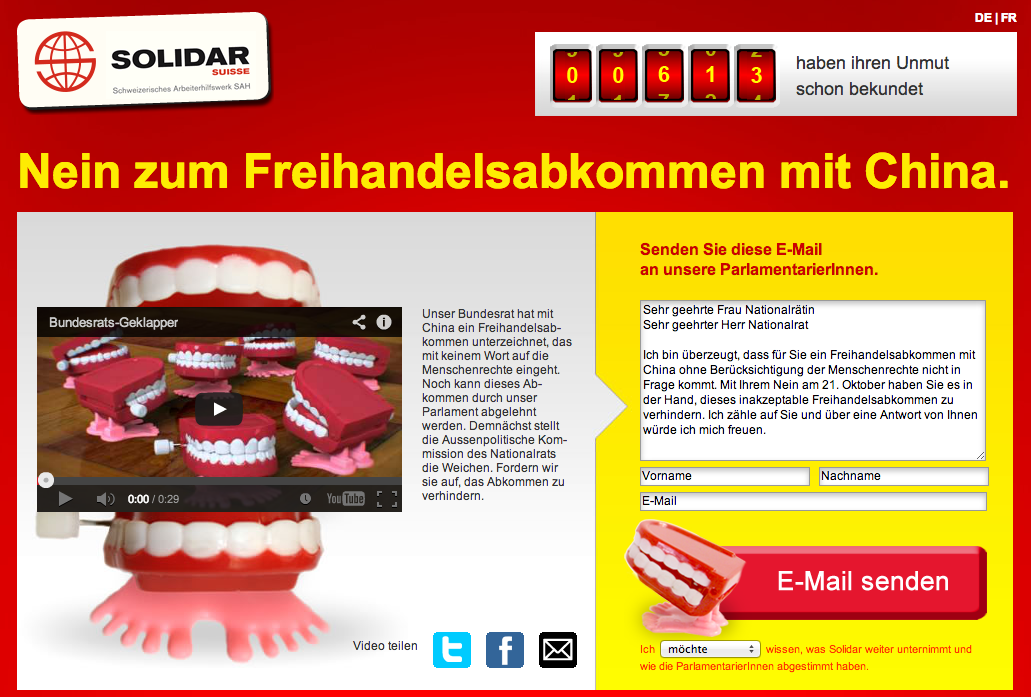 In der Schweiz hat Avaaz mit verschiedenen Petitionen über 355’000 Email-Adressen gesammelt. Die riesige Datenbank übertrumpft selbst die grössten Schweizer NGOs und Parteien um das Vielfache. Die Bürgerpetitionen sind mittlerweile ein integraler Teil von Avaaz.