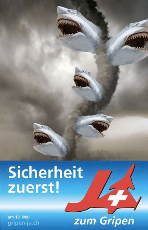 Was aber lief ab dem 8. Mai anders? Nachdem ich mir erlaubt hatte, das Plakat in Reaktion auf die ulkige Hebebühnenaktion der Gripen-Befürworter erneut zu posten, staunte ich nicht schlecht, als der Blogger Philippe Wampfler eine halbe Stunde später ein eigenes «Sharknado»-Plakat präsentierte und mich damit in Sachen Trash locker toppte.